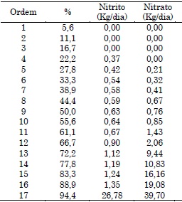 Em relação aos nutrientes nitrito e nitrato, as curvas de probabilidade das cargas diárias são mostradas na figura 3.