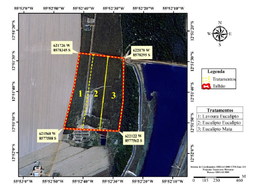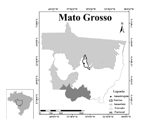 As queimas controladas foram realizadas na Fazenda Santo Antonio (pertencente a Empresa Brasil Foods - unidade de Lucas do Rio Verde), no município de Sorriso, região centro-oeste, mesorregião geográfica médio-norte do estado de Mato Grosso, considerada como transição Cerrado-Amazônia. As parcelas foram inseridas entre as latitudes 12° 32’ 43” S e as longitudes 55° 42’ 41” W, com altitude média de 365 metros e topografia plana (Figura 1).