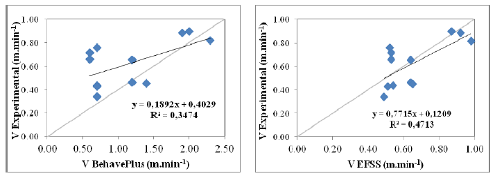 As velocidades simuladas apresentaram um comportamento similar ao do experimento, visto que os maiores valores ocorreram na posição EL em setembro e agosto, enquanto que os menores foram obtidos na posição EF em junho e julho (Tabela 1). Em geral, as correlações entre a velocidade de propagação estimada (variável independente) e a experimental (variável dependente) apresentaram baixos coeficientes de correlação (Figura 3).