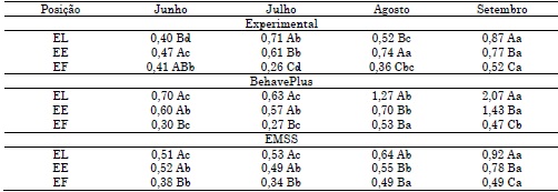 - Para velocidade do vento (km.h-1): - EL: 1,79; 1,73; 2,74 e 4,54 m.s-1; - EE: 1,60; 1,75; 2,38 e 3,62 m.s-1; - EF: 0,88; 0,59; 2,02 e 1,67 m.s-1, entre junho e setembro, respectivamente.