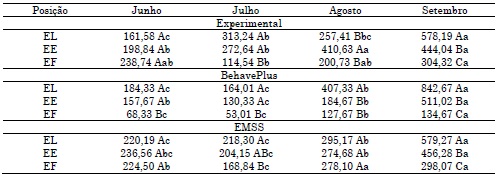 Na prática, o comprimento da chama é a variável com maior facilidade de obtenção visando a descrição da energia liberada, e, portanto, é importante a sua previsão para indicar o comportamento do fogo durante uma queima controlada (FERNANDES, 2009). As simulações no BehavePlus foram subestimadas em junho e julho nas posições EF e EE. Fernandes (2002, 2009) e Stephens et al. (2008), utilizando o BehavePlus encontraram valores de comprimento da chama subestimados em comparação as observações experimentais. White (2014) encontrou valores de comprimento das chamas durante queimas controladas 2,47 vezes superior aos valores simulados. Esse comportamento pode ser decorrente das variações de material combustível nas posições no talhão, visto que o BehavePlus pode ser entendido como um sistema de previsão do comportamento do ponto de combustão, sendo mais indicado para ser usado na análise do crescimento e comportamento do fogo para vegetações homogêneas com dados meteorológicos estáticos, evitando erros nas simulações (ANDREWS, 2008).