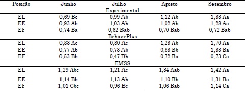 - Para temperatura do ar (°C): - EL: 29,62; 32,99; 36,13 e 40,01 °C; - EE: 32,29; 32,97; 36,77 e 39,69 °C; - EF: 30,69; 27,94; 32,67 e 37,68 °C, entre junho e setembro, respectivamente.