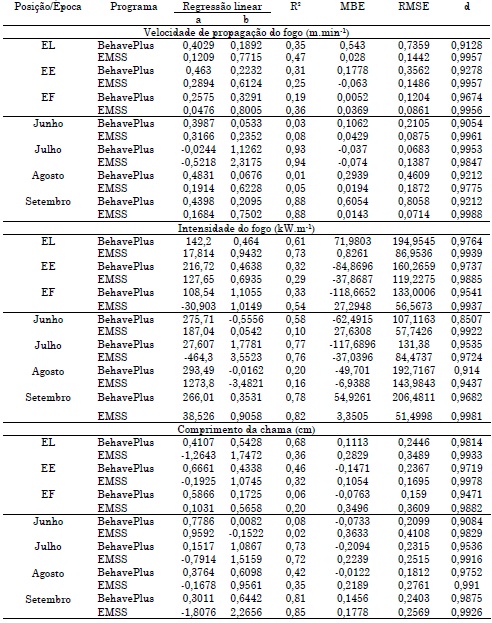 Quanto aos desempenhos estatísticos, os espalhamentos observados (RMSE) na velocidade de propagação do fogo variaram de 0,08 a 0,81 m.min-1, com menores valores de RMSE e maiores ajustamentos (d) obtidos com EMSS, independentemente da época do ano e posição no talhão. Para a intensidade do fogo (I), os espalhamentos variam de 56,6 a 206,5 kW.m-1, com maiores ajustamentos obtidos com EMSS. Todavia, quanto ao comprimento de chama (L), os menores desvios médios (MBE) foram obtidos pelo BehavePlus, independentemente da época e da posição no talhão. Os espalhamentos do comprimento de chama simulado oscilaram de -0,15 a 0,41 m, sendo os ajustamentos superiores a 91%. Os indicativos estatísticos obtidos em junho demonstram que os softwares não propiciam boas simulações para queimas controladas a serem realizadas no início da estação seca.