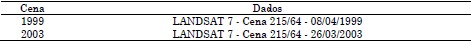 Foram utilizadas duas cenas obtidas pelo Satélite LANDSAT 7, que possui 30 metros de resolução espacial, compostas cada uma pelas bandas espectrais 2, 3 e 4 (Tabela 1), com cobertura máxima de nuvens de 10%, nos períodos chuvosos de cada ano, adquiridas no catálogo de imagens do Instituto Nacional de Pesquisas Espaciais (INPE, 2013).
