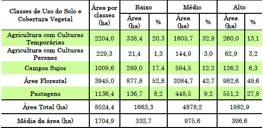 é a média das áreas dos usos do solo no Baixo, Médio ou Alto Una;