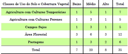 A Tabela 1 mostra os usos do solo e cobertura vegetal adotados para a amostragem de solo com suas respectivas áreas no Baixo, Médio e Alto Una, enquanto que, a Tabela 2 mostra o número de amostras pertencentes ao conjunto dos números naturais para cada tipo de uso do solo no Baixo, Médio e Alto Una, conforme as sentenças estabelecidas nas Equações 1 e 2.