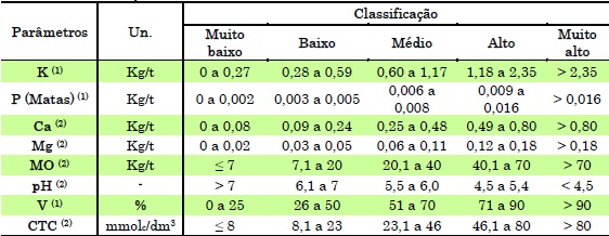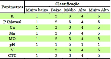 Para gerar o indicador de qualidade do solo, os mapas com a distribuição dos atributos do solo foram classificados segundo faixas de valores estabelecidas pelo Instituto Agronômico de Campinas (IAC) e pela Comissão de Fertilidade do Solo do Estado de Minas Gerais que estudam a fertilidade dos solos nos Estados de São Paulo e Minas Gerais (RAIJ et al., 1996; RIBEIRO et al.,1999).