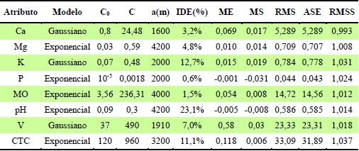 Através dos parâmetros mostrados na Tabela 5 da análise geoestatística efetuada por meio do ajuste do modelo teórico ao semivariograma experimental é possível observar que os atributos do solo estudados apresentaram forte dependência espacial por meio do cálculo do IDE (CAMBARDELLA et al., 1994). Dentre os modelos teóricos utilizados, os apresentados na Tabela 5 são os com valores de ME e MS mais próximos de zero e mais semelhantes de RMS e ASE, o que diminui a incerteza associada às predições, somente o CTC apresentou variação superior a 1% e próxima de 3,6%. Entretanto, Ca, MO, V e CTC apresentaram valores altos de RMS indicando uma alta variabilidade entre os valores preditos e verdadeiros. Em relação aos valores de RMSS, todos os atributos do solo estudados apresentaram valores próximos do ideal que é igual a 1 (TATALOVICH et al., 2006; GEORGAKARAKOS; KITSIOU, 2008; PASINI et al., 2014).