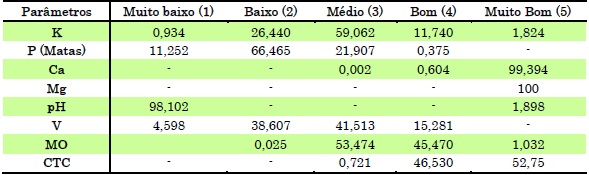 Os mapas que apresentavam a distribuição dos atributos do solo foram reclassificados conforme as classes presentes na Tabela 3 e atribuído valores a essas faixas de classificações que variavam de 1 a 5, onde 1 indicava péssima qualidade e 5 ótima qualidade conforme pode ser visto na Tabela 4. Somente aos valores do pH do solo foram atribuídos valores diferentes aos demais atributos, uma vez que, segundo a Comissão de Fertilidade do Solo do Estado de Minas Gerais, valores entre 5,5 a 6,0 são considerados adequados, enquanto que, os valores que não se encontram dentro desse intervalo são considerados inadequados. Para os valores de pH classificados como adequado foi atribuído valor igual a 5 e para os classificados como inadequado valor igual a 1.