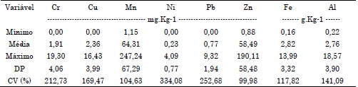 Verifica-se que as concentrações dos elementos em estudo nos sedimentos apresentaram elevado coeficiente de variação, conforme classificação de Gomes (2000). Tal fato, pode ser justificado em função do material de origem da formação geológica, associado com a pressão antrópica proveniente dos diversos empreendimentos situados na área urbana consolidada, contribuindo com a descarga de resíduos e efluentes não tratados no corpo hídrico, corroborando com os apontamentos de Barbosa et al. (2010). Já Morais et al. (2010), relatam a existência do descarte de efluentes domésticos e industriais, além de abatedouro de boi e frango, de salinas e de Carcinicultura, em especial esgotos in natura nas suas águas.
