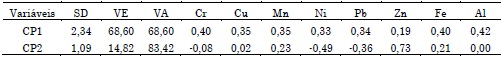 No CP1 o Cr, Cu, Mn, Fe e Al foram as variáveis com maiores cargas (Tabela 4). Este CP explicou 68,60% da variância dos dados e descreve a matriz geoquímica representada pelos elementos metálicos de origem geoquímica natural (associado com os óxidos de Mn e Fe). O CP2 explicou 14,82% da variabilidade dos dados e é representado pelo Ni, Pb e Zn, denominado de componente de origem antrópica. Isto demonstra que estes elementos têm o mesmo comportamento ou provêm da mesma fonte, o que é enfatizado pelo fato que a amostra 24, adjacente a pequenas propriedades rurais e descarte de efluentes da carcinicultura, além da presença de biomassa em suspensão, podendo inferir que a origem desses metais no ponto 24 é antropogênica e está relacionada a uma fonte pontual.