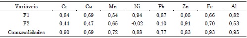 As comunalidades foram altas para as variáveis apresentadas, exceto Cu, assim, a maior parte da variância para cada uma das variáveis foi explicada pelos dois componentes comuns (Tabela 5).