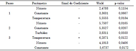 A fim de se perceber a relação entre a variabilidade temporal (período seco e chuvoso) e parâmetros físico-químicos e biológicos levantados, aplicou-se uma regressão logística (Tabela 1). A partir dos coeficientes gerados nessa análise, conclui-se que o melhor modelo foi obtido quando haviam sido incluídas as variáveis nitrato, temperatura e turbidez, uma vez que, somente essas três variáveis trouxeram boa explicabilidade ao modelo, sendo, no presente caso, como as de maior relevância na caracterização da variabilidade temporal. A análise ainda sinaliza que, além dessas três variáveis, nitrogênio amoniacal e DQO devem ser levados em consideração na avaliação da variabilidade temporal. Os demais parâmetros não entraram no modelo por terem sido apresentado com baixo poder de explicação. É possível inferir também que, para os parâmetros nitrato, turbidez e DQO existem uma correlação inversa entre ocorrência e probabilidade de período chuvoso, tendo em vista que o coeficiente foi negativo.