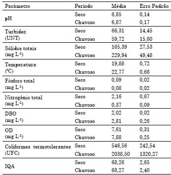 Nota-se, de acordo com a Tabela 2, que não houve diferença significativa (p>0,05) entre os períodos seco e chuvoso para o IQA, bem como para os seguintes parâmetros que o compõe: pH, turbidez, sólidos totais, fósforo total, oxigênio dissolvido e coliformes termotolerantes. Já as características temperatura e DBO apresentaram diferença significativa no nível considerado, tendo, ambas, apresentado valores médios mais elevados no período chuvoso.