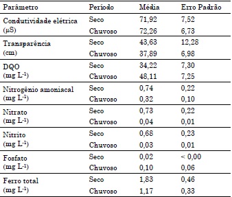 Na Tabela 3, observa-se que, no conjunto dos parâmetros avaliados e que não compõem o IQA, um maior número de parâmetros apresentou diferença significativa no comparativo entre períodos seco e chuvoso. Foram eles: DQO, nitrato e nitrito. Para os demais parâmetros, a saber: condutividade elétrica transparência, nitrogênio amoniacal e ferro total, não foram verificadas diferenças significativas.