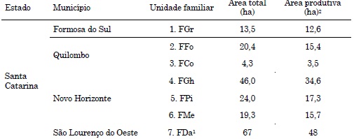 De acordo com a população, os critérios de inclusão e os de exclusão foram selecionadas como unidades de análise seis unidades familiares em processo de transição agroecológica localizados nos municípios de Quilombo (2), Novo Horizonte (3) e Formosa do Sul (1), além da seleção aleatória de uma unidade familiar com sistema produtivo convencional localizado em São Lourenço do Oeste (1) (Tabela 01). As famílias estão identificadas com a letra “F” adicionada das iniciais de seu primeiro sobrenome.