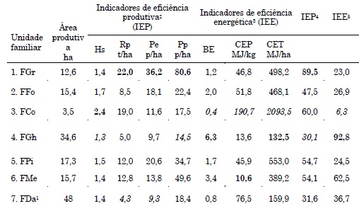 O processo agroecológico em cada unidade iniciou em diferentes momentos e por diferentes motivações; no entanto, existiu, predominantemente, um discurso sobre a construção de consciência socioambiental e a melhoria da saúde. Para a continuidade da análise das unidades familiares e seus sistemas produtivos, foram identificados e analisados os valores de cada indicador, para posteriormente calcular os índices de eficiência produtiva e energética, buscando uma análise mais integradora que compreenda o comportamento de cada sistema estudado. A tabela 02 demonstra os resultados da avaliação dos sete indicadores levantados e seus respectivos índices, nos sete sistemas estudados.