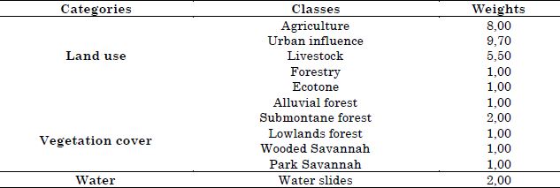 The Anthropic Transformation Index (ATI) was determined from the area percentages of the thematic classes quantified in the land use and the vegetation cover map of each sub-basin. The index was calculated using the formula: ATI ( ((%USE X WEIGHT(/100.