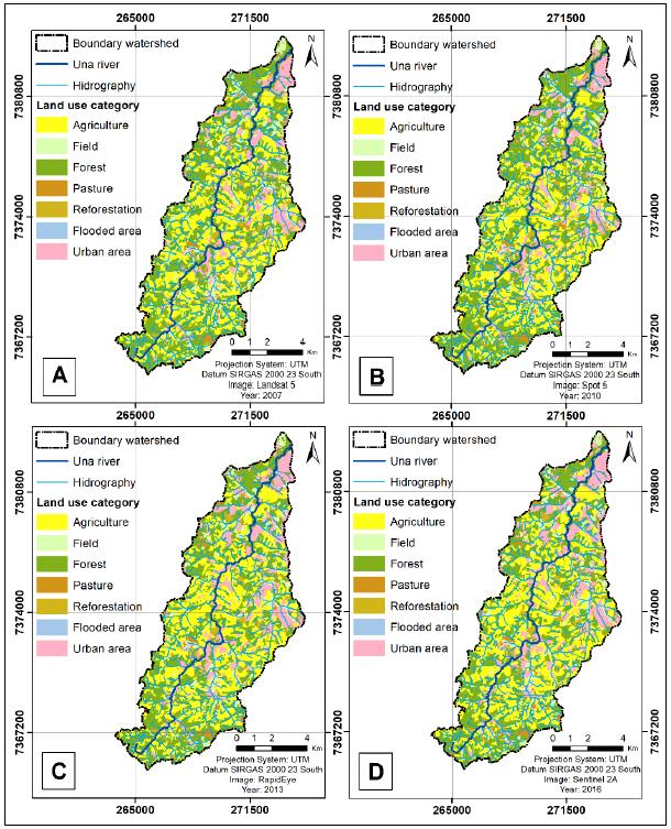 Table 2 shows the quantification of the categories for the years 2007, 2010, 2013, and 2016. Figure 2 shows land use maps in the Una river watershed.