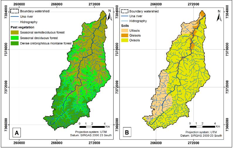The past vegetation map was obtained by clipping the vector file of the past vegetation map of Brazil (IBGE, 2004) to the study area and by the construction of a Digital Elevation Model (DEM), both used to determine the forest formation that existed in the watershed.