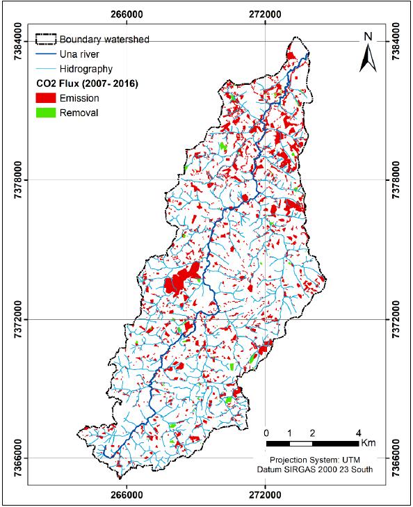 The main contribution to CO2 emissions in the Una river watershed consists of vegetation suppression to meet the demand for agriculture and urbanization. Moreover, it was shown that CO2 emissions were higher than its removals.