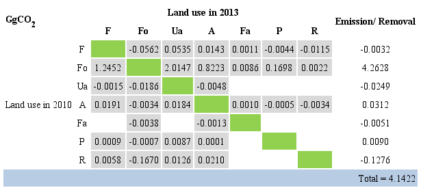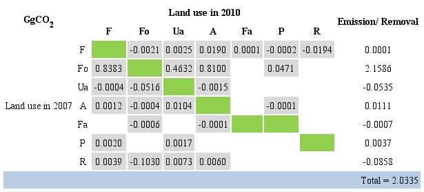 Tables 9, 10, and 11 show the estimates of net CO2 emissions from 2007 to 2010, 2010 to 2013, and 2013 to 2016, respectively. Gray cells represent CO2 emissions (positive values) or removals (negative values) from one period to the next. Green and noncolored cells do not have values, the first because it corresponds to the category in which there were no transitions from one period to the next, and the other because there was no transition. In the Emission/Removal column, we have the total net issue for each category. Lines represent the previous year and columns the following year (CETESB, 2011; 2012).