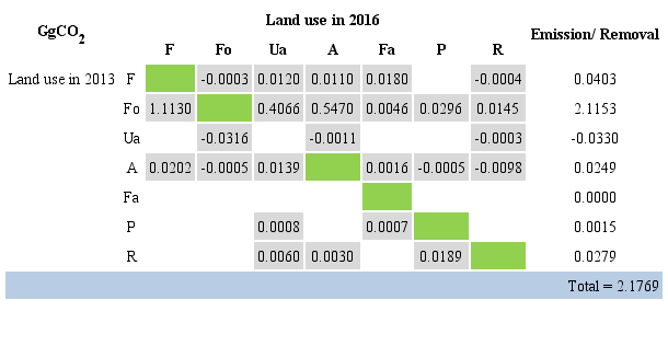 A positive result means that CO2 was emitted into the atmosphere, while a negative result indicates CO2 removal from the atmosphere. The values of tons of carbon were converted to Gigagram (Gg) of carbon. Later, using Equation 4, these values were transformed into CO2 Gigagram. The results were presented in a matrix and specialized through ArcGIS 10.3.