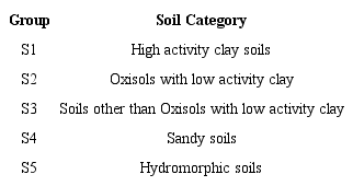 The textures found vary between clayey, clayey-sandy loam, clayey-sandy, and clayey loam. Together with the soil types, this information made it possible to classify soils into five groups proposed by Bernuox et al. (2002), as shown in Table 4.