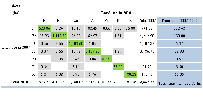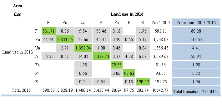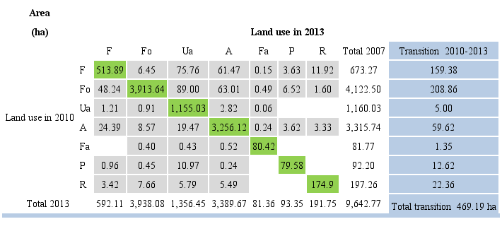 When comparing the transitions in Table 8 with previous periods, it is noted that the least amount of transitions occurred in this period. However, the forest category still accounted for the main changes.