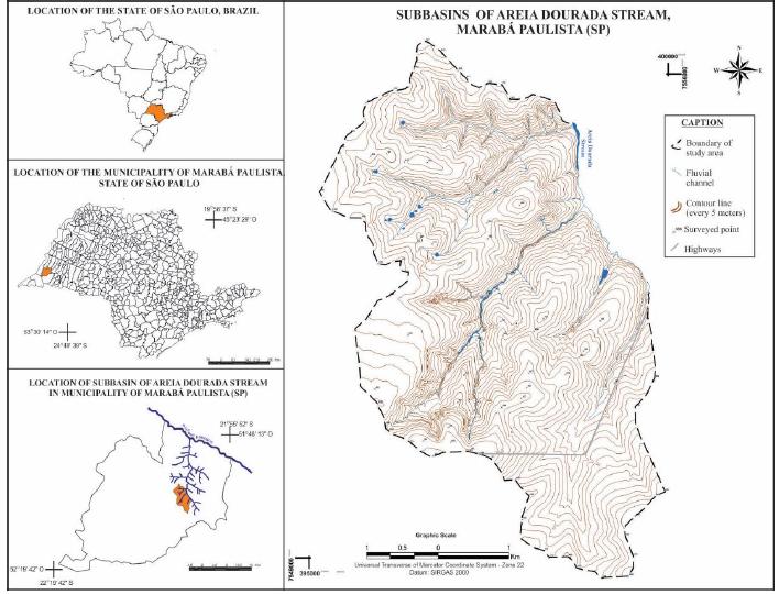 Within this context, we aimed at identifying the effect of anthropic actions on erosion processes and valley forms throughout 53 years in a degraded rural area, in a set of subbasins of the Areia Dourada stream (Figure 1), located in the municipality of Marabá Paulista, Western region of the state of São Paulo - Brazil.