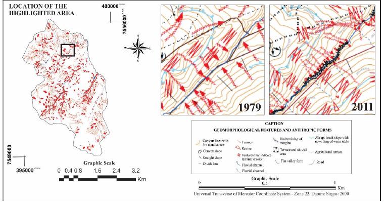 Abstract: Different studies of geomorphological science are dedicated to understanding the effect of human action on the natural dynamics of environments. Following it, this article aims to identify the effect of agriculture and conservation techniques on the dynamics of slope and bottoms of valley processes in a degraded rural area. We selected, for it, the sub-basins of Areia Dourada stream, located in the city of Marabá Paulista (SP), as objects of study, in which we used the principles of retrospective mapping, with the mapping of land use and superficial surface cover and the geomorphological features of 1963, 1979, 1997, 2011 and 2016. For the analysis, along with the mappings and field records, we used the Pearson’s Correlation Coefficient (p), together with quantified data, to evaluate the changes of the forms of relief from land use in the five mapped years. As a result, we verified: joint development of the erosive processes in different topographic compartments; feedback system between slope and bottoms of valley processes; the low efficiency of the agricultural terraces, both in the cultivated areas, but especially in the pasture areas, in order to contribute to the erosive dynamics by feeding erosive subsurface processes, while not containing the surface ones.