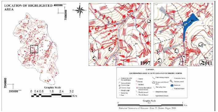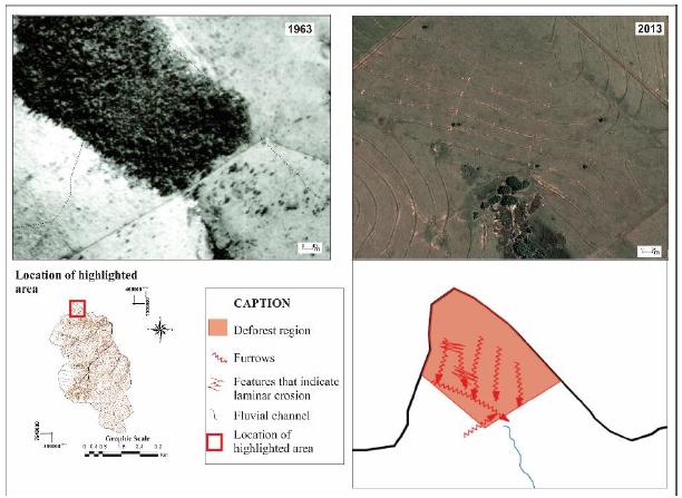 To do so, we used principles of retrospective mapping for surveying data on geomorphology and land use, as well as statistical techniques for analyzing the surveyed information, seeking to identify changes and hypothesizing the influence of human activity on the intensity and dynamics of geomorphological processes.