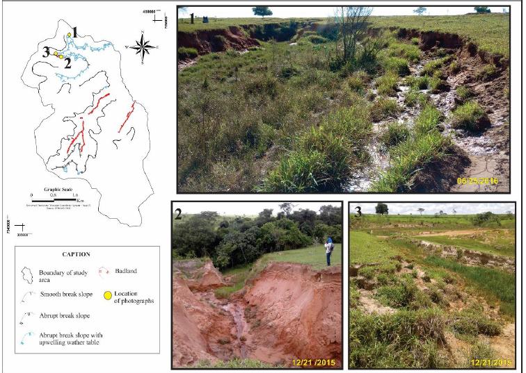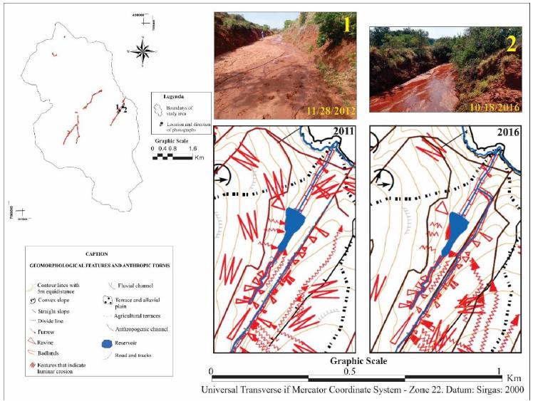 Through the applied techniques, we identified the erosion and depositional dynamics of the study area, in addition to verifying the connection between erosion forms in the several topographic elements of the area. These erosion forms provoked changes in valley forms, with the undermining of river margins, promoting the collapse of lower slopes and the emergence of many ravines. Such ravines increase the flow of water and sediments in valley forms, establishing an erosion-alluvial deposits cycle that provides feedback.