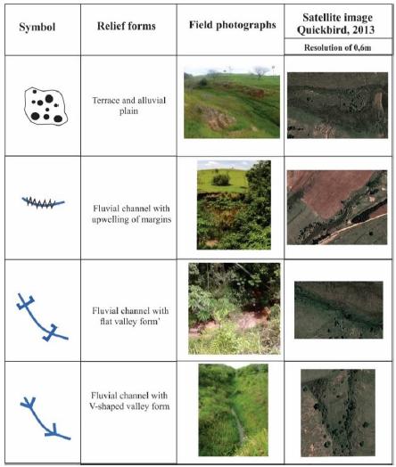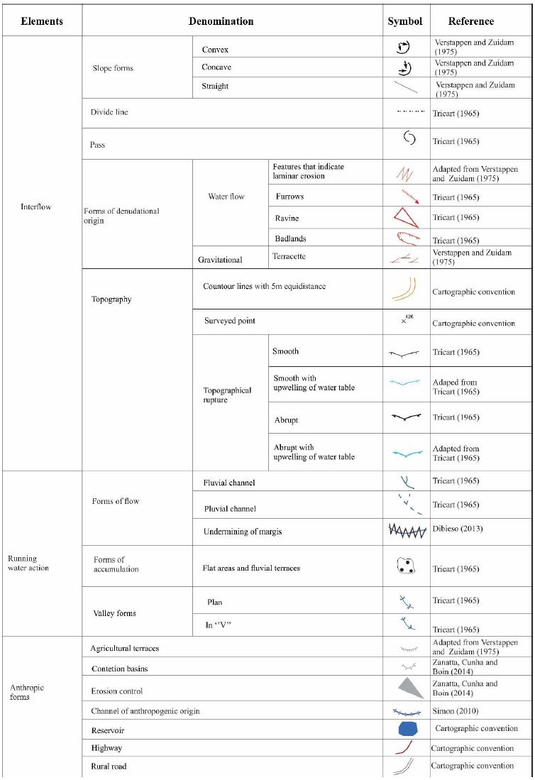 When choosing features to be mapped and the symbology to be used in geomorphological maps, we followed the principles of the French mapping system (TRICART, 1965) and the system of the International Institute for Aerial Survey and Earth Science (ITC) - which is currently called the University of Twente’s Faculty of Geo-Information Science and Earth Observation, whose aim is to develop capacity and to utilize geospatial solutions to deal with national and global problems - proposed by Verstappen and Zuidam (1975), since we sought for procedures that enabled us to recognize dominant morphogenetic processes. We adapted the methodologies to meet the studied universe, and created new symbols for typical features of the area, which did not exist in the original proposals; in addition, we assigned different colors to highlight erosion features, mapped in red, and the anthropic forms, mapped in gray (Figure 2).