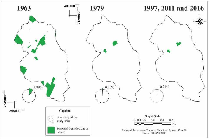 From the formation of the village to the first mapped year, 1963, a period of approximately three decades, we found a reduction of about 90% of the native forest cover in the study area, i.e., 9.89% of the 4,623 ha that compose the subbasins (Figure 4).