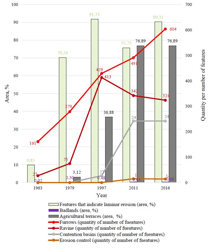 Soil covers that replaced the Seasonal Semideciduous Forest throughout these five years provided an expressive and growing increase in erosion forms in number (furrows and ravines) and affected area (features that indicate laminar erosion and badlands) in the 53 analyzed years, even when employing conservation techniques from 1979 onwards, which did not mitigate erosion effects in the area in the following years (Figure 6).