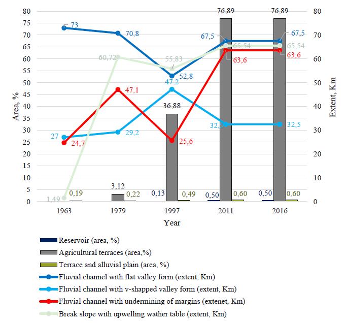 According to the obtained information, we observed the proportional increase in erosion features, in addition to the greater use of agricultural terraces in the study area, as well as the extent of upwellings of water table due to abrupt break slopes, reflecting the significant changes in valley forms that occurred especially from 1997 onwards, and where the use of agricultural terraces became the standard of cultivated areas (Figure 7).