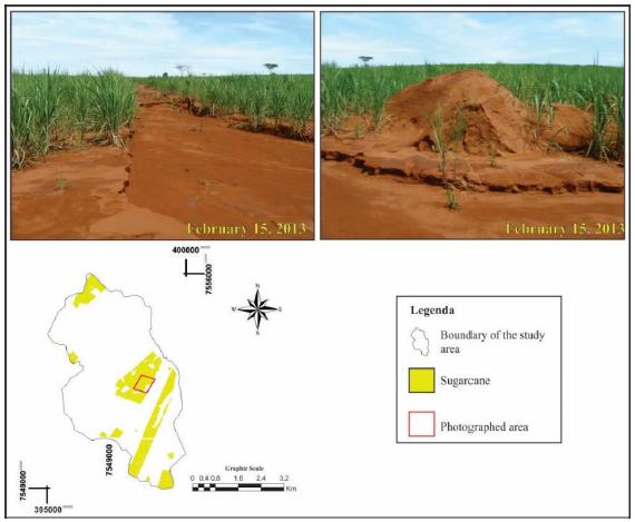 Regarding temporary crops, the correlation was negative, being strong with badlands and very strong with features that indicate laminar erosion. In the field, we noted features that indicated laminar erosion and the formation of furrows in areas for sugarcane cultivation. We could not map these features due to the constant corrections of agricultural terraces (Figure 8).
