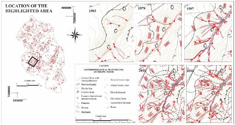 In the northernmost sector of the study area (Figure 14), agricultural terraces provided a higher volume of abrupt break slopes with upwelling of water table within sectors of land overgrazing. Under these circumstances, of excessive use and greater flow of water deriving from break slopes with upwelling of water table, we noted the formation of badlands in 2011 and in 2016.