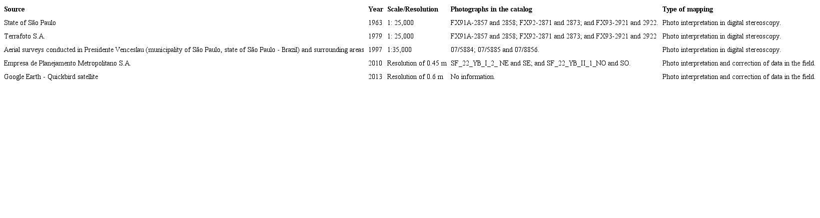 With materials of the years 1963, 1979, and 1997, concerning aerial surveys conducted in flight lines, we were able to work with digital stereoscopy, thus acquiring the three-dimensionality of the features. To this end, we followed the guidelines proposed by Souza and Oliveira (2012) for obtaining the anaglyphs from the StereoPhoto Maker software. Conversely, for materials dated from 2010 and 2013, which consisted in orthophotographs and satellite imagery, we corrected the data in the field due to the impossibility of obtaining three-dimensionality of the features through the aforementioned method.