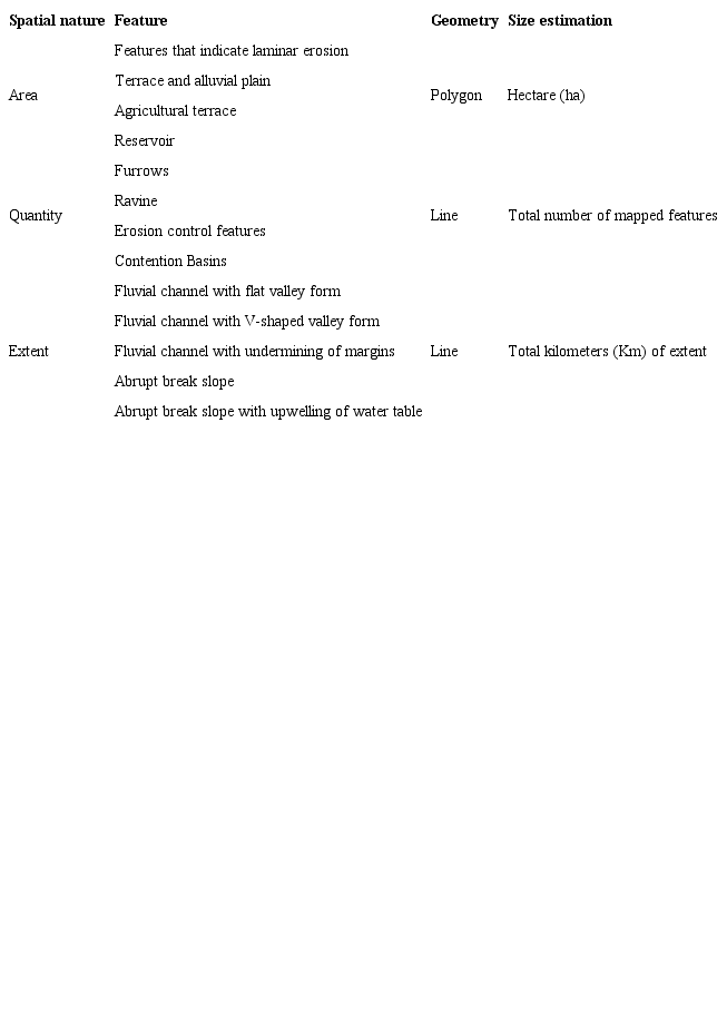 We mapped geomorphological features according to their spatial nature and adopted the geometry (points, line, polygons) that best adapted to their characteristics. Hence, we quantified data as regards area (hectare), quantity (number), or extent (km) according to the adopted mapping procedure (Table 2). Features calculated in hectare were transformed into percentages of the area concerning the total area of the subbasins.