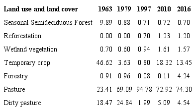 In 1963, surface soil covers that replaced the Seasonal Semideciduous Forest were divided between temporary crops (46.62%), pasture (23.41%), and dirty pasture (18.47%). In the following period, 1979, the temporary crop area decreased to 3.63%, and pasture (69.09%) and dirty pasture (24.84%) prevailed. In 1997, pasture occupied 94.78% of the entire study area (Table 3).