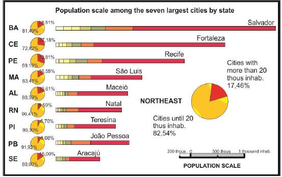 As we can see in figure 01, there is a distance in the population size between the state capitals in relation to the other urban centers of its interior. First, we highlight the large percentage of small centers (82.54%), many of which are run by the nearest intermediate articulation centers (IBGE, 2011). We believe that this very common scenario in the interior of the Northeast is linked to the accelerated process of political and administrative emancipation of several municipalities in the region that gave cities the status of all these new municipalities.