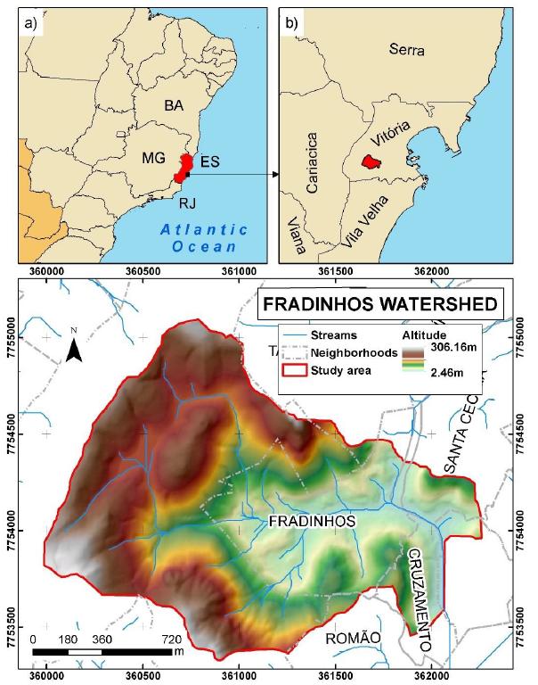 This study was conducted at the Fradinhos watershed (2.27 km²) located on Vitoria, capital of the Espirito Santo state. There are approximately 20.000 inhabitants in the watershed area, which accounts for a little over 5% of Vitoria’s population (estimated on 360.00 inhabitants) (IBGE, 2019).