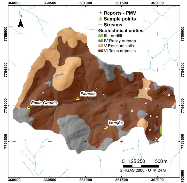 The Landfill unit associates to the watershed’s outlet, where once there was a mangrove. This unit is prone to flooding and structural settlements. The Rocky outcrops unit is associated to thin soils and slopes steeper than 35%. This unit is prone to rock falls and slides, and thus there is an indication to use the areas with inclinations below 20%. The Residual soil unit presents soils with thickness up to 10m, in areas with slope inclination between 20-35%. The area is prone to shallow landsliding and erosional process, so the land use is free to areas with inclinations below 30%. The Talus deposit unit is composed by transported materials, and therefore the soils have heterogeneous texture, high porosity and permeability varying from medium to high. The areas with steepness between 5-45% have proneness to erosional process and mass wasting (VITÓRIA, 2014).