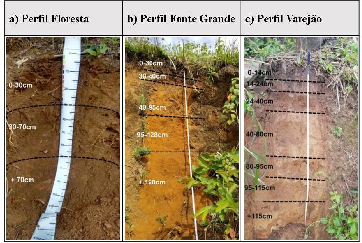 From the morphological characterization carried out on the sampled profiles, three classes of soil were identified. The Floresta profile is a soil developed from a colluvium deposit, divided in deposition layers with an incipient pedogenesis. The Fonte Grande profile has morphological characteristics of a yellow Oxisol and the Varejão profile presents typical characteristics of a Haplic Inceptisol.