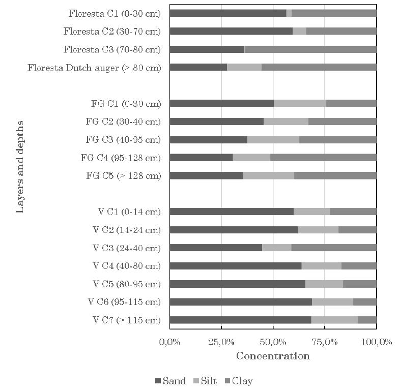 At the Fonte Grande profile there were five layers, with total depth surpassing 128 cm. The first layer, between 0-30 cm depth, presents bioturbation activity by worms and termites. At the Varejão profile there were seven layers, with total depth surpassing 115 cm. Figure 5 shows the granulometric distributions from the sampled profiles, with its layers and depths.