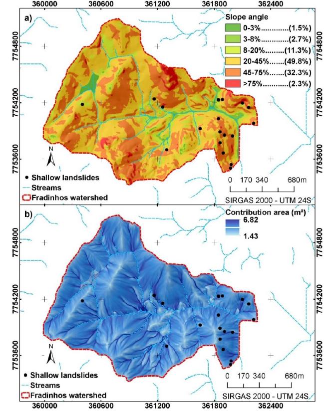 Figure 6 shows the slope angle and contribution area of the study watershed. The flatter surfaces, with slope angle reaching 8%, are associated to valley bottoms, with great flow convergence. Slope gradients superior to 45% are associated to convex slopes and middle and upper thirds of the hillsides.