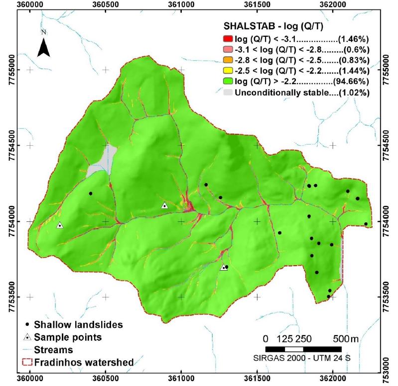 Of the 21 shallow landslides reports registered by the Vitoria Civil Defense on the Fradinhos watershed, 20 were modelled on the class log Q/T > -2.2 - which is considered the less unstable class. One report had its class modeled in the range -2.5 < log Q/T < -2.2 - considered a class of medium instability (LISTO; VIEIRA, 2012; ZAIDAN; FERNANDES, 2009, 2015).