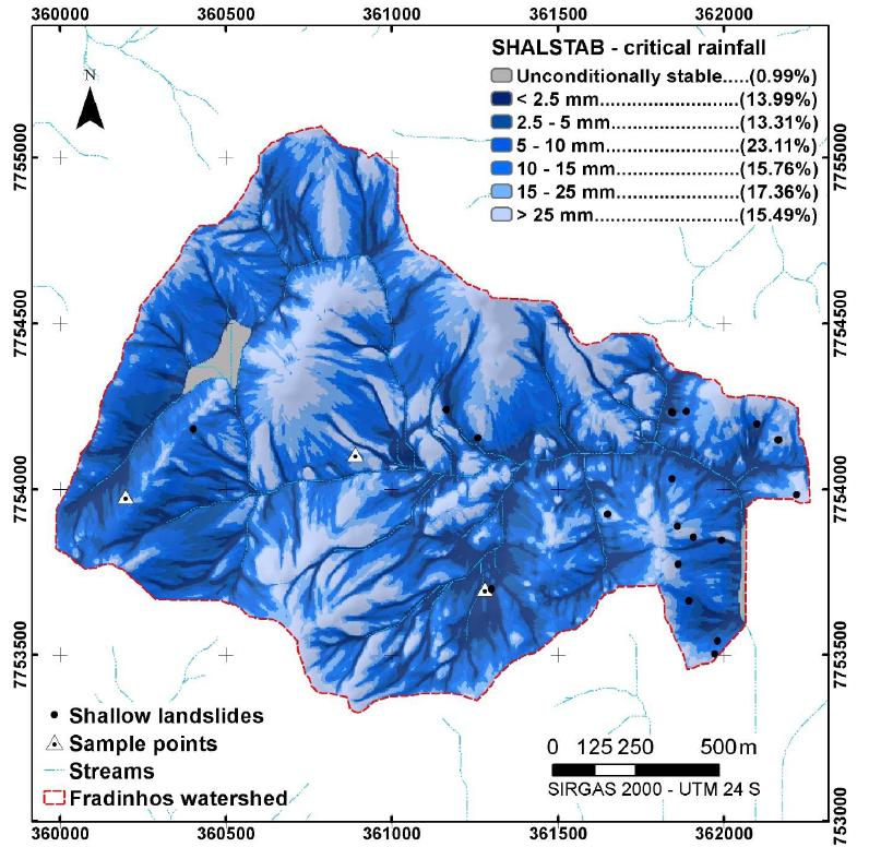 The SHALSTAB model was an effective tool for generating critical scenarios, even with the limitation of not considering the temporal change of the soil’s pore-pressure characteristics. Therefore, adopting transient models is a promising avenue for shallow landslides researches.